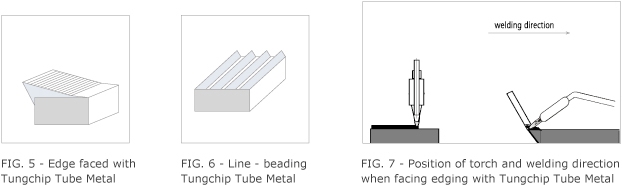 Tungchip Tube Metal is oxyacetylene welded so preliminary heating of the separate components is unnecessary. Larger components, however, for which the required binding temperature of ca. 850°C cannot be attained, should either be pre-heated in a furnace or else be brought to between 500 - 600°C (dark red) with a larger welding or pre-heating torch. Choose a welding torch a size or two smaller than is used for ordinary joint welding. The flame should be adjusted to neutral as illustrated in Figure 3.